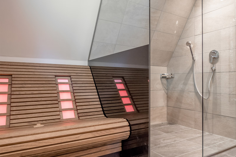 Offener Badezimmerbereich mit Wanne, Wellnessdusche, Infrarotkabine und separatem WC